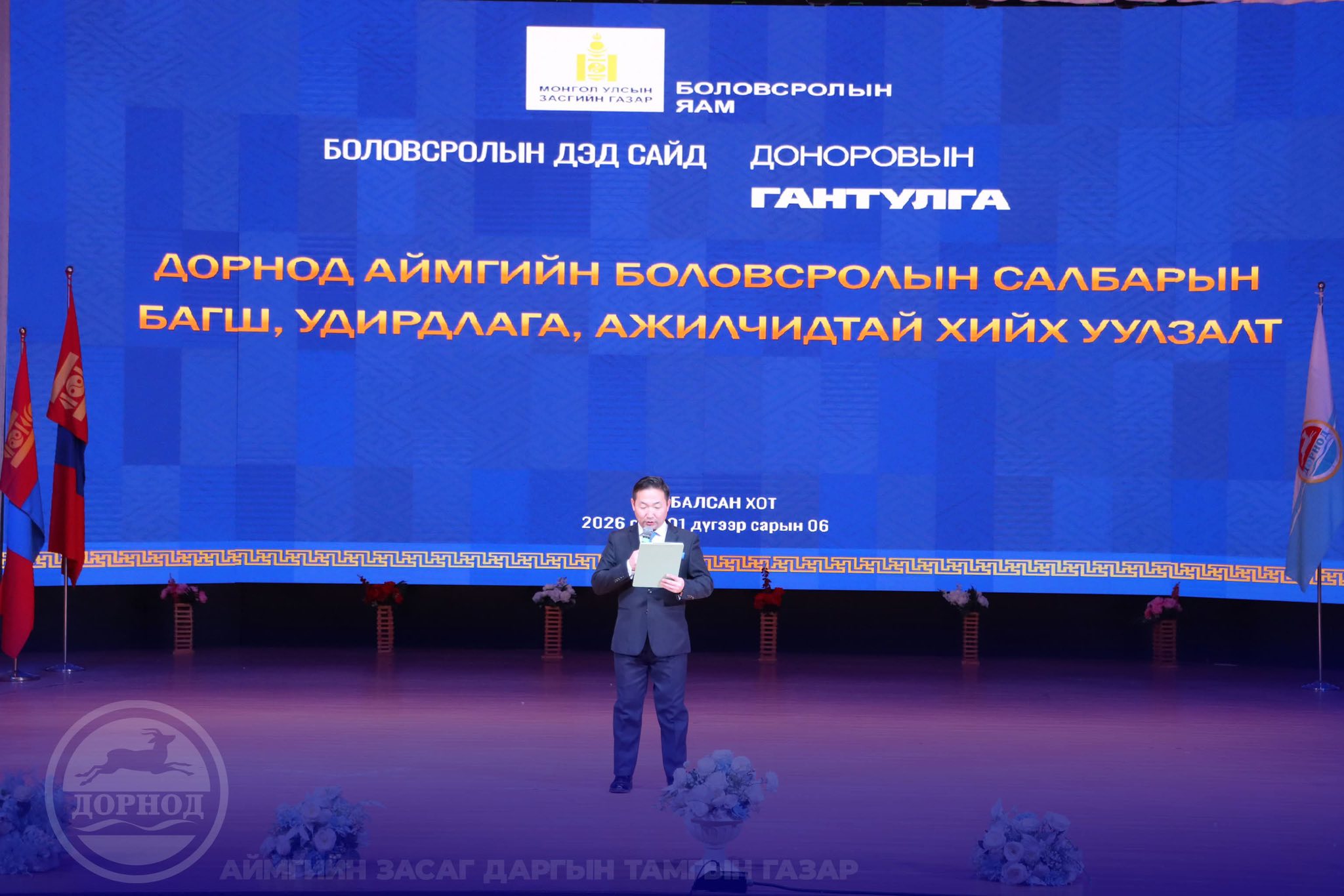 Боловсролын дэд сайд Д.Гантулга манай аймагт ажиллах үеэрээ боловсролын салбарын багш, ажилтан, албан хаагчидтай уулзалт зохион байгууллаа. Монгол Улсын Засгийн газраас 2026 оныг “Боловсролыг дэмжих жил” болгон зарласантай холбогдуулан салбарын бодлого, зорилт, хэрэгжүүлэх арга хэмжээний талаар мэдээлэл өгч, энэ онд боловсролын салбарт баримтлах бодлого, хөрөнгө оруулалтын чиглэл, багш, ажилтнуудын цалин хөлсний нэмэгдэл, сургалтын хөтөлбөрийн шинэчлэл, цахим болон хиймэл оюунд суурилсан боловсролын хөгжлийн талаар дэлгэрэнгүй танилцууллаа.